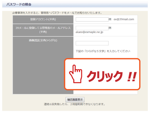 🟦 よくある質問(管理者) "ログインできない" "パスワード を忘れた" 回答 「パスワード照会フォーム」が用意されています✅ パスワード照会 ・登録アカウント(半角)・39メールに登録してる管理者のメールアドレス(半角)・画像認証(全角ひらがな)※3項目を正しく入力することによって「契約者確認」ができ 改めて「パスワード」が発行されます✅ アカウント 「サービス登録」した時に決めた「空メールアドレス」です