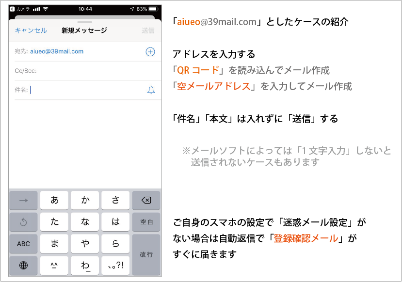 "空メール"を送信することで"会員登録"します
